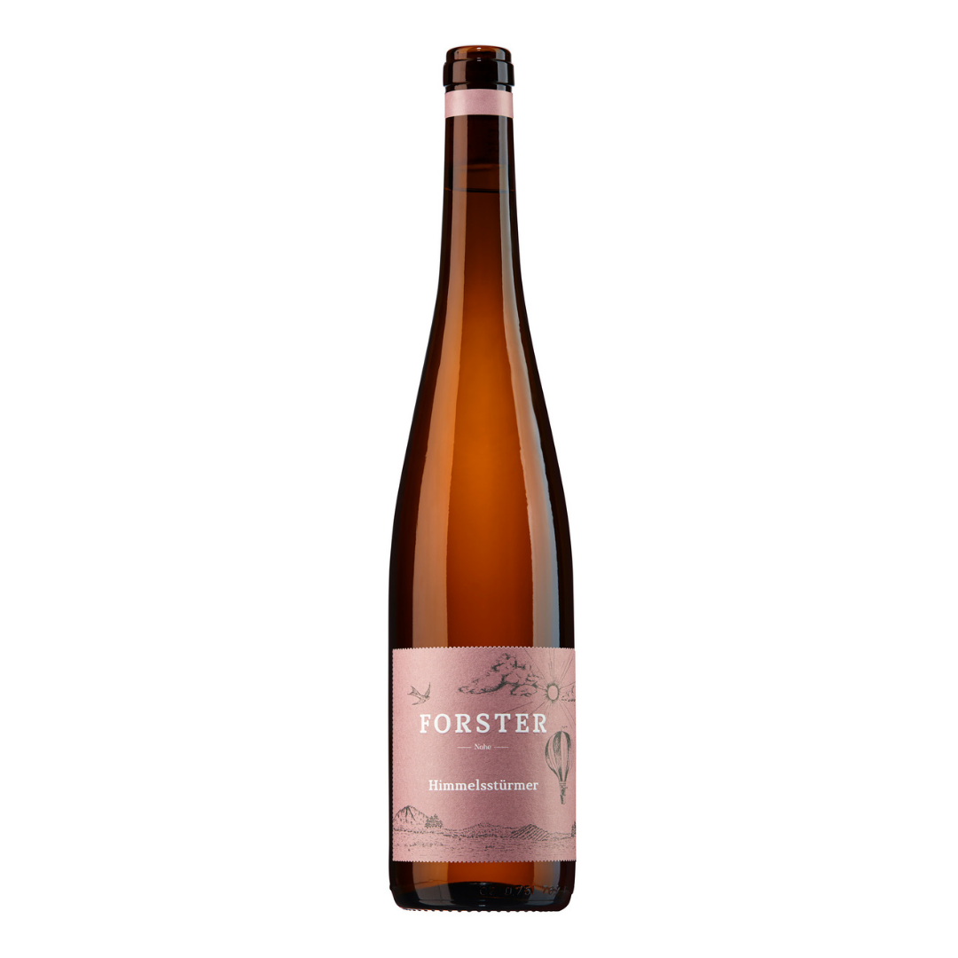 Flasche Wein  vom Weingut Forster aus Rümmelsheim an der Nahe, Sorte Spätburgunder Blanc de Noir mit Namen Himmelsstuermer. Mit Korken und altrosa Etikett, das mit weißer Schrift das Logo Forster sowie die Sorte zeigt, zudem eine gezeichnete Landschaft mit Sonne, Wolken, Schwalbe und Heissluftballon.